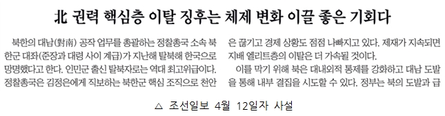 조선일보는 <사설/北 권력 핵심층 이탈 징후는 체제 변화 이끌 좋은 기회다>(4/12, https://me2.do/F87Fvr5w)에서 ‘선거용 북풍’을 운운하며 의혹을 제기하는 것은 적절하지 않다는 황당한 주장을 펼치기도 했다. 사설은 “제재가 지속되면 지배 엘리트층의 이탈은 더 가속될 것”이라며 대북제재의 효과를 강조한 뒤 정치권을 향해 “북의 잇단 핵·미사일 도발에도 제대로 된 안보 공약 하나 내지 않”더니, “연쇄 탈북에 대해 선거용 ‘북풍’ 아니냐고 논란을 벌이는 것은 적절해 보이지 않는다”고 지적했다. “정부의 발표 과정에 다소 오해의 소지가 있었다 하더라도 더 중요한 것은 북의 핵 도발을 막고 폭압적인 김정은 체제를 바꾸는 최선의 방안을 찾는 일”이라는 것이다.