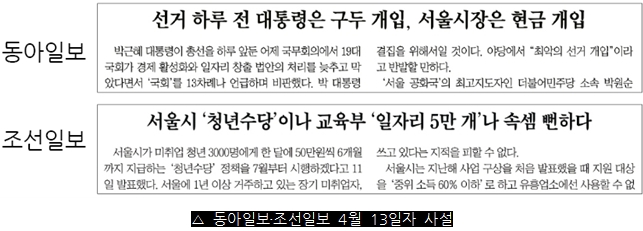 2. 대통령․정부부처 선거개입, 서울시 청년수당과 견줘 ‘물타기’ 나선 동아․조선