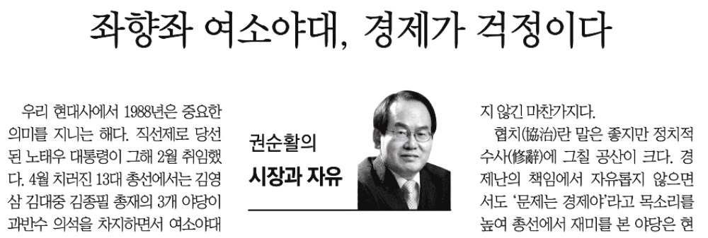 △ 동아일보 <권순활의 시장과 자유/좌향좌 여소야대, 경제가 걱정이다> 칼럼