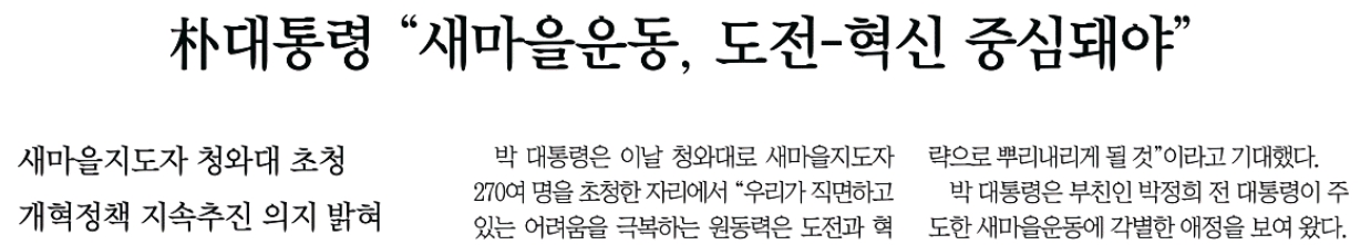 ‧ 동아일보 <朴대통령 “새마을운동, 도전-혁신 중심돼야”>(4/21, 8면, https://me2.do/Fi6caxKP)