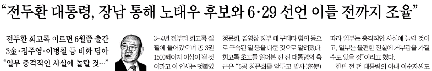 ‧ 조선일보 <“전두환 대통령, 장남 통해 노태우 후보와 6·29 선언 이틀 전까지 조율”>(4/21, 6면, https://me2.do/xfOvrMoc)