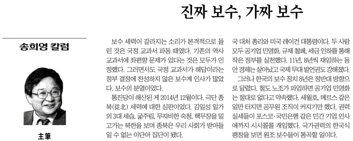‧ 조선일보<송희영 칼럼/진짜 보수, 가짜 보수>(4/23, 26면, 송희영 주필, https://me2.do/52LKBHVa)