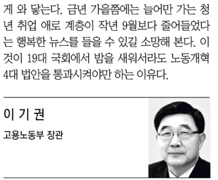 그러나 이 장관의 이 같은 ‘청년 사랑’은 곧바로 노동4법 통과 촉구로 이어진다. “임금·근로시간·고용계약관계의 불확실성 및 불공정성, 연공서열적인 임금체계, 대기업과 중소기업 간 지나친 격차”가 현재 청년 고용 문제의 핵심이며 “약속했던 노동개혁 입법 등이 늦어지면서 청년 취업 애로 계층은 6개월 만인 올해 3월 10만 명이 더 늘어 121만 명으로 늘었다”는 식이다.