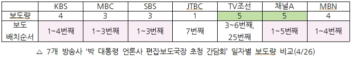 보도량은 TV조선과 채널A가 각 5건으로 가장 많고, KBS와 MBN이 각 4건, MBC와 SBS가 각 3건이었다. 반면 JTBC는 1건뿐이었다.