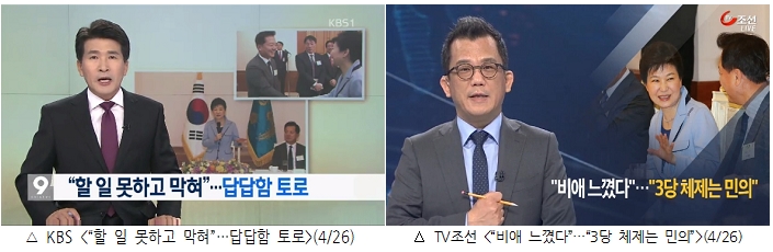 <오늘의 방송보도>‘대통령 확성기’로 전락한 방송사들, KBS는 ‘애정공세’(2016.4.27)■ 오늘의 나쁜 방송 보도(4/26)