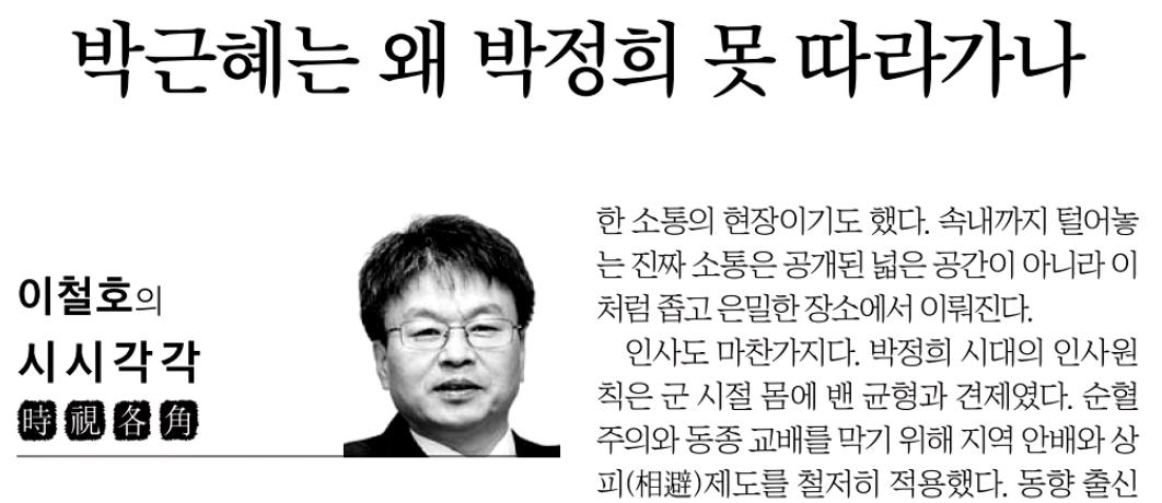 중앙일보 이철호 논설실장은 박근혜 대통령을 향해 “정치적 리더십의 두 기둥은 소통과 인사”임에도 이 두 가지 모두 제대로 하지 못하고 있다며 ‘쓴 소리’를 내놨다.