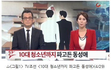 TV조선 톱보도인 <10대 청소년까지 파고든 동성애>(4/29, 박상현 기자)는 “오늘 뉴스쇼 판은 지금까지 남의 나라 일로만 여겨졌던 동성애가 10대 청소년들 사이에서도 늘어나고 있다는 충격적인 소식으로 시작합니다”라는 앵커 발언부터 ‘충격적’이다. 동성애를 ‘남의 나라 일’로만 여겼다는 것도 황당할 뿐 아니라, ‘10대 동성애’가 ‘충격’이라는 대목도 성소수자를 완전히 배타적으로 바라보는 편견과 혐오를 고스란히 드러내는 발언이기 때문이다. 또한 오현주 앵커는 “에이즈 감염 경로를 두고 논란이 있긴 하지만 시내 곳곳에는 남성 동성애자를 위한 클럽들이 운영되고 있고, 인터넷에서도 동성애를 다룬 만화를 쉽게 접할 수 있는 게 2016년 대한민국의 모습입니다”라고 말했다. 이 또한 에이즈 감염경로와 남성 동성애를 교묘히 연결시키는 명백한 왜곡이다.
