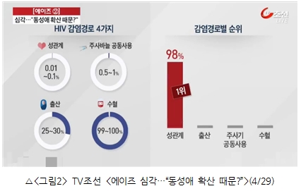 이어진 <에이즈 심각…“동성애 확산 때문?”>(4/29, 2번째, 임유진 기자)는 에이즈의 원인이 남성 동성애인지에 대한 찬반양론을 살펴보았다. 에이즈는 HIV 감염인과의 혈액 교환 등을 통해 감염되기 때문에 동성애 여부와 관계없이 콘돔 등 예방책 없는 모든 성관계가 감염을 일으킬 수 있다는 것이 학계의 정설이다. 한국에이즈퇴치연맹도 홈페이지에 ‘Acquired lmmune Deficiency Syndrome, Gerald J.Stine,Ph.D.에서 발췌’라는 학술 자료 출처 표기와 함께 이성 간 성관계인 '콘돔 없는 질내사정'이 콘돔착용 후 항문성교보다 감염 위험이 더 큰 것으로 명시하고 있다.