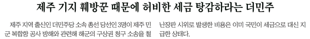 게다가 조선일보 사설은 “제주 지역 출신인 더민주당 소속 총선 당선인 3명이 제주 민군 복합항 공사 방해와 관련해 해군의 구상권 청구 소송을 철회해 달라고 2일 국방장관에게 요구”한 것을 비난했다. 제주지역 더민주 당선자 3인을 지적하는 것에서 나아가, “더민주의 전신인 새정치민주연합은 노무현 정부가 시작한 강정 기지 건설을 좌파 단체들과 손잡고 반대했다. 이번엔 여소야대를 앞세워 시위 책임을 덮자고 하고 있다. 정치권이 매번 이런 식으로 나오니 불법 시위의 악순환이 끊어지지 않는다”면서 야당이 마치 불법 시위를 조장하는 불순 세력인 양 부각한 셈이다. 여러모로 참으로 나쁜 보도가 아닐 수 없다.