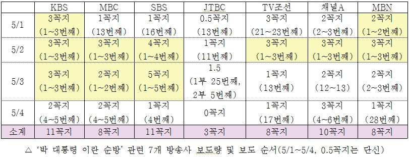 먼저 보도량과 보도 배치를 비교해보았다. 박 대통령 이란 순방 보도를 가장 많이 보도한 방송사는 각 11꼭지를 보도한 KBS와 SBS이었다. 채널A는 10꼭지, MBC와 MBN, TV조선이 각 8꼭지를 보도했다. JTBC는 3꼭지만 보도해서 방송사 중 보도량이 가장 적었다. 이란 순방 보도를 톱보도로 가장 많이 배치한 방송사는 1일부터 3일까지 3일 연속으로 톱보도로 3꼭지씩 배치한 KBS이다. MBC와 SBS, MBN도 관련 보도를 이틀 연속 톱보도로 배치했다. 이란 순방 보도는 종편보다는 지상파 3사가 적극적으로 많이 주요하게 보도했다고 평가된다. 지상파 중에서도 가장 주요하게 관련 보도를 부각한 방송사를 꼽는다면, KBS이다. 보도량은 SBS와 같지만 대통령의 별다른 행보가 없었던 5월 1일부터 톱도로로 배치하며 3꼭지나 내놓았고, <앵커&리포트>와 같은 심층보도로서 사실상 2꼭지라고 봐도 무방한 보도를 내놓는 등, 대통령의 이란 일정을 가장 주요하게, 또 가장 많이 다뤘기 때문이다.