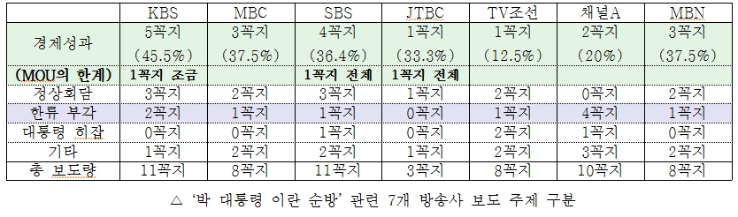 KBS와 SBS는 경제성과 관련 보도가 각각 5꼭지(이란 순방 관련 보도 대비 45.5% 차지), 4꼭지(36.4%)를 차지했다. 반면 TV조선은 1꼭지(12.5%)만 경제성과에 할애했다.