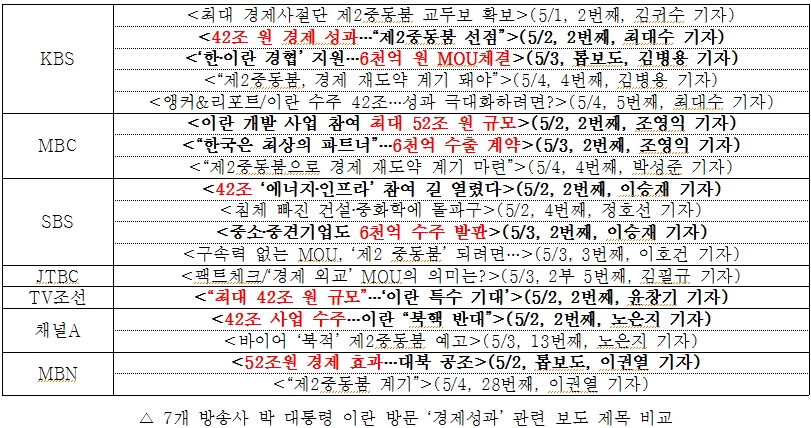 TV조선, MBN은 2일 이란 방문의 경제성과 관련 보도는 이미 전날 전했던 소식임을 감안했는지 이후에는 관련 보도가 없었다. 채널A는 <바이어 ‘북적’ 제2중동붐 예고>에서 ‘경제성과’를 찬양했으나 4일에는 보도가 없었다. 공영방송 KBS, MBC만 귀국 날까지 연이어 대통령의 경제성과를 부풀리며 ‘수행 언론’으로서의 역할을 충실히 한 셈이다.