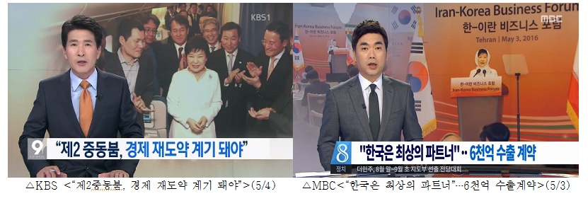 MBC처럼 제목부터 수치를 과장하지는 않았지만 총 5건의 보도로 경제성과를 찬양한 KBS의 보도도 별반 다르지 않다. KBS <‘한‧이란 경협’ 지원…6천억 원 MOU체결>(5/3, 톱보도, 김병용 기자)는 “1:1 현장 비즈니스 상담회를 통해 하루 만에 31건, 6천여억 원의 양해각서가 체결돼 향후 경제협력 성과에 기대감을 높여줬습니다”라며 대통령의 ‘경제성과’에 찬사를 보냈다. 귀국일인 4일에는 <“제2중동붐, 경제 재도약 계기 돼야”>(5/4, 4번째, 김병용 기자)에서 “제2의 중동붐을 만들어나갈 수가 있는데, 경제 재도약을 이룰 수 있는 모멘텀이 되도록 많이 챙겨 나가려고 합니다”라는 박 대통령의 발언을 전하면서 “371억 달러가 걸린 66건의 양해각서가 본계약으로 이어지도록 하기 위해 범정부 차원에서 지원하고, 테헤란의 우리 대사관에 별도 지원 조직도 설치할 계획”이라고 덧붙였다.