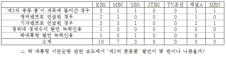 이처럼 청와대와 언론이 강조한 ‘경제성과’는 ‘제2의 중동붐’이라는 표현으로 집약된다. 대부분의 방송사도 이란의 경제제재 조치가 풀리는 것을 기회로 한국이 ‘제2의 중동붐’을 기대하고 있고, 실제 그것이 실현된 것인 양 보도했다. 보도에서 이 표현을 얼마나 사용했는지 세어보았다. 그 결과 KBS는 제목으로 ‘제2의 중동 붐’을 언급한 경우만 3건이나 되었다. 앵커멘트로 사용한 경우도 KBS 2회가 가장 많았고, 대통령과 청와대 경제수석의 발언을 녹취인용하는 과정에서도 총 10번 ‘제2중동붐’이 등장했다. KBS 다음으로는 MBC가 가장 많이 ‘제2 중동붐’을 언급했다.