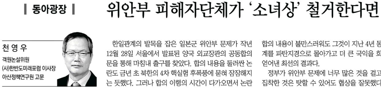 천영우 객원논설위원 한반도미래포럼 이사장 아산정책연구원 고문은 동아일보 6일 칼럼 코너인 동아광장을 통해 위안부 피해자단체가 소녀상을 철거하는 ‘도덕적 우월성’을 보여야 한다고 주장했다.