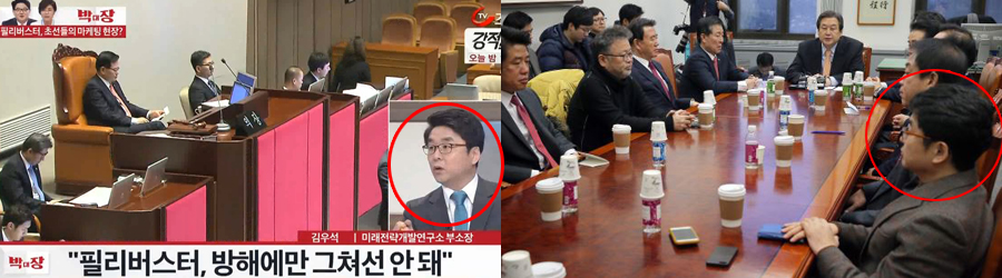 △TV조선 <이슈해결사 박대장>(2/24) 화면 갈무리 △새누리당 총선기획단 회의(1/20) 참가중인 김우석 씨 모습