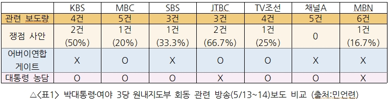 박근혜 대통령과 여야 3당 원내지도부의 첫 회동을 보도량을 살펴보면 MBN이 6건으로 가장 많았고, 채널A와 MBC가 5건이었다.