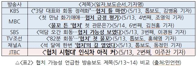 지상파 3사와 TV조선, 채널A는 견해차가 드러난 쟁점현안을 외면하고도 보도 제목에 ‘협치 가능성’을 명시했다. 쟁점현안만 중점적으로 보도한 JTBC의 <‘협치 시험대’ 인식차 아직 커>(5/13)라는 보도 제목과는 대조적이다.