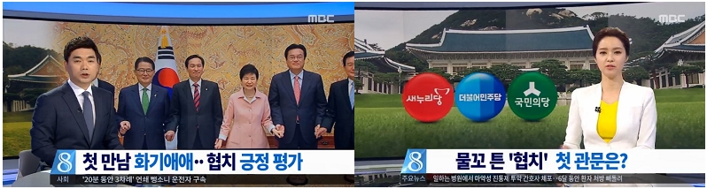 박근혜 대통령과 여야 3당 원내지도부의 첫 회동에 대해서 방송사들은 어떻게 보도했을까. 회동 당일인 13일, 방송사들은 관련내용을 톱보도로 타진하며 ‘협치 가능성’에 방점을 찍었다. 지상파 3사와 TV조선, 채널A는 세월호 참사 특별법 등 이견이 드러난 논의 내용은 ‘수박 겉핥기’ 식으로 설명해놓고 보도 제목에 ‘협치 가능성’을 명시했다. MBC는 13일 ,14일 이틀에 걸쳐 ‘협치 가능성’을 보도 제목에 명시하면서 박 대통령의 태도 변화를 지나치게 찬양했다. 뿐만 아니라, 세월호참사 특조위가 대전MBC 이진숙 사장에 동행명령을 전달하려 한 사안을 언급하면서 ‘특조위 활동의 부적절성’을 강조하기까지 했다.