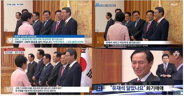 한편, 김성식 국민의당 정책위의장에게 “근데 그 유재석 (개그맨) 씨와 비슷하게 생기셨나요?”라고 묻는 대통령의 농담은 지상파 3사와 TV조선, 채널A가 모두 공유한 ‘특급 아이템’이었다.