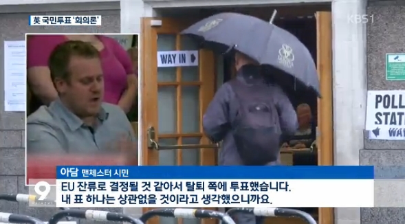 KBS <“분위기에 휩쓸려”…영 유권자 뒷감당 ‘쩔쩔’>에서 황상무 앵커는 보도 시작부터 “영국민들은 막상 일을 저질러 놓고, 결과가 나오자 당혹해 하는 기색이 역력”하고 “충분한 정보도 없이 분위기와 감정해 편승해 표를 던진 유권자가 많아 국민투표 회의론까지 대두되는 상황”이라고 규정했다. 리포트는 인터넷 포털 구글의 ‘브렉시트 개표 뒤 검색 순위’를 보여주면서 “유럽연합 탈퇴는 무엇을 뜻하는가, 심지어 유럽연합이 뭐냐는 질문”이 많아 “전 세계를 허탈하게” 했다고 전했다. 이것이 “영국인들이 브렉시트의 기초적 의미조차 모른 채 투표했다”는 사실을 보여준다는 것이다. 이민우 특파원은 “유럽연합 잔류로 결정될 것 같아서 탈퇴에 투표했습니다. 내 표 하나는 상관없을 것이라고 생각했으니까요”와 같은 영국 시민의 인터뷰를 덧붙여 영국민의 투표행위가 즉흥적이고 어리석었음을 분명히 드러냈다. 이어서 “분위기에 휩쓸려 투표가 이뤄지면서 직접 민주주의의 한계를 드러냈다”는 분석을 덧붙였다. 이렇게 영국민을 몰아붙인 KBS는 “이번 투표 결과가 포퓰리즘에 영합해 자극적 선동을 일삼은 3류 정치의 산물”이라는 결론으로 보도를 마무리했다.