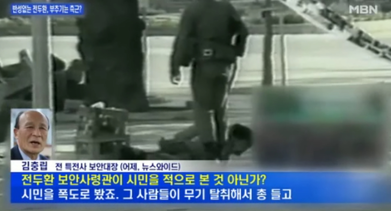 이렇게 2016년 보수언론들이 총동원되어 전두환 씨에 대한 변호를 앞 다투어 쏟아내는 사이, 종편도 제대로 한몫을 했다. 김충립 씨는 전 특전사 보안대장이다. 이런 김 씨가 TV조선 <장원준의 신통방통>(5/17)과 MBN <뉴스와이드>(5/17)에서 전화 인터뷰를 통해 같은 주장을 반복한 것이다. 특히 MBN <뉴스와이드>는 5월 13일 김 씨를 직접 출연시킨 후, 5월 17일 전화 인터뷰를 진행했으며, 18일에는 인터뷰 중 주요 발언을 뽑아 거듭 소개했다. 진행자 송지헌 씨는 김 씨의 주장에 비판적 태도를 보였으나, 어떤 지적을 하더라도 5‧18을 앞두고 전두환 씨의 책임을 부정하는 인물의 주장을 반복해서 내보내는 행위 자체를 하지 않는 것이 적절했다. 특히 김 씨는 17일 전화 인터뷰에서는 “무기 탈취해가지고 총 들고 달려들고 싸우니까 폭도로 보고 진압한 것”이라거나, “아무리 백성들이 억울하다고 하고 해서 부마사태 때 그 사람들이 폭도들이 가서 무기고 깨고 총 들고 와서 사격했냐? 총 들고 탈취하고 사격하니까 상대방이 총을 안 가졌으면 왜 쏘겠냐”라고 주장했다. 신군부에 항거한 광주시민들을 폭도를 모는 황당한 주장이며, 총을 들지 않은 시민들을 무차별 학살했던 진실마저 왜곡한 것이다. 5‧18 기념식 전날과 당일, 역사적 사실조차 난도질하는 이의 목소리를 내보내야 했을까?