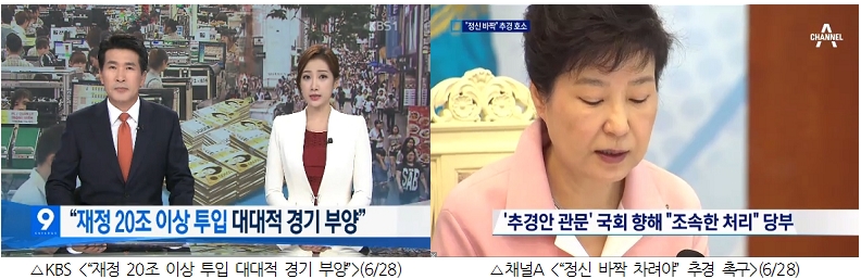 종편 방송사에서는 채널A의 태도가 두드러진다. 채널A <“정신 바짝 차려야” 추경 촉구>는 “박근혜 대통령은 국민의 편에서 추경 편성을 결정했다며, 모두가 경각심을 가져야 한다고 강조” “추경안 집행의 관문인 국회를 향해 조속한 처리를 당부하며, 발목잡기는 없어야 한다는 당부”했다며 박 대통령 입장을 전하더니, “야당이 다른 현안과 연계할 가능성을 배제할 수 없다는 게 변수”라고 덧붙였다. 채널A 보도를 요약하자면 대통령이 “국민의 편”에서 추경을 편성했는데 야당이 ‘발목잡기’할 가능성이 있어 변수라는 것이다. 그 어떤 상황에서도 정부를 옹호하고 야당은 폄훼하겠다는 집념이 돋보인다.
