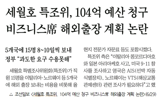 · 조선일보 <세월호 특조위, 104억 예산 청구 비즈니스席 해외출장 계획 논란>(6/29, 1면, 선정민 기자, https://me2.do/5Badrxme), <231건 채택한 특조위, 10개월간 조사 끝낸건 1건>(6/29, 3면, 곽래건·원선우 기자, https://me2.do/GinJyHoa), <예산담당 공무원이 반대하자 특조위원장 측이 104억案 작성>(6/29, 3면, 선정민 기자, https://me2.do/FrnsFvjn), <12월까지 선체 조사활동 보장 정부의 절충안… 특조위 거부>(6/29, 3면, 곽래건 기자, https://me2.do/5Sc7gaRG)