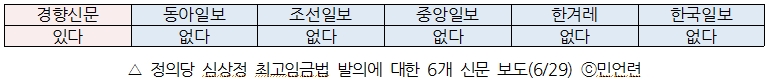 ·정의당 심상정 최고임금법 발의, 경향만 보도