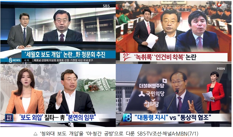 SBS는 <‘세월호 보도 개입’ 논란…야 청문회 추진>에서 1일 국회 운영위에서 강병원 더민주 의원이 “온 국민이 슬픔에 싸여 있을 때 이런 보도통제를 한다는 게 말이 되겠습니까?”라고 질의하자 이원종 청와대 비서실장이 “홍보수석 본연의 임무에 충실하기 위해서 아마 협조를 구했던 것이 아닌가…”라고 답하는 모습을 화면으로 보여줬다. 여기다 “위난 사항이 있을 때 언론과의 협조를 통해서 그런 걸 함께 극복하려고 하는 것 그게 저는 홍보수석의 역할이라고 생각했고”라는 이정현 전 수석의 해명도 덧붙였다. TV조선, 채널A, MBN도 모두 SBS 보도와 똑같은 구도를 취했다.