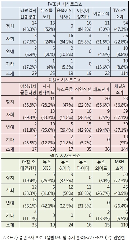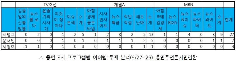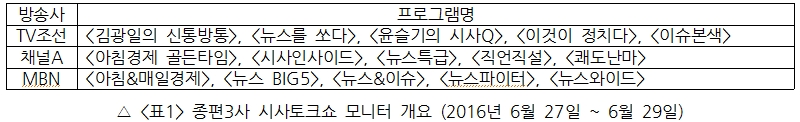 [종편 시사토크쇼]종편 3사 6월 27일~29일 아이템 분석 모니터보고서(2016.7.6)