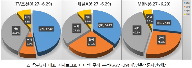 종합편성채널(이하 종편)의 시사토크쇼에서 연예 아이템 비중이 심각한 수준에 이르렀다. 최근 가수 박유천 성폭행 논란, 배우 김성민 사망, 홍상수-김민희 불륜설 등 관련 이슈들이 연이어 터진 점을 감안하더라도 주제를 벗어난 이야기 전개, 연예인의 신변잡기적 내용 등이 지나치게 많았다. 민주언론시민연합(이하 민언련)은 6월 27일~29일 TV조선, 채널A, MBN의 대표적 시사토크쇼를 모니터했다. 해당 프로그램들이 연예 이슈에 치중하는 사이 주요 사회 아이템은 제대로 다뤄지지 않았다. 시사토크쇼가 아닌 ‘한낮의 TV연예’라는 비판이 나오는 이유다.