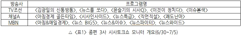 그런데 종합편성채널(이하 종편) 시사토크쇼들이 ‘정권의 공영방송 보도 통제’라는 사안의 본질을 외면한 채 물타기로 일관하고 있다. 종편의 주장은 청와대와 새누리당의 입장과 같다. 통화 내용은 역대 홍보수석의 통상업무이며, 이 전 수석의 거친 말투 역시 대통령에 대한 과잉충성에서 비롯된 읍소로 봐야 한다는 것이다. 그가 최고 권력기관인 청와대 홍보수석이었다는 사실, 다시 말해 힘의 불균형에 따른 외압이 작용할 수밖에 없다는 핵심은 도외시 했다. 민주언론시민연합(이하 민언련)은 6월 30일부터 7월 5일까지 TV조선, 채널A, MBN의 대표적 시사토크쇼 15개를 모니터했다.