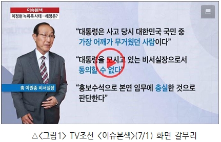 게다가 채널A <쾌도난마>(7/1)는 논란의 당사자인 이정현 전 수석을 출연시켜 “국가의 위기를 빨리 탈출시키기 위해서 언론의 협조를 요청하는 것은 기본적이고 아주 당연한 역할”이라는 일방적 해명에 힘을 실어주기까지 했다.