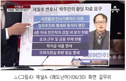 한편 이 기간 시사토크쇼 프로그램들은 세월호 집회 당시 주최측의 집회를 빚은 일선 경찰서장 2명의 개인정보자료를 요구한 박주민 더불어민주당 의원에 대해 ‘갑질’ 이미지를 덧씌웠다. 특히 요청자료 19건 가운데 부채현황 등 개인 신상에 관한 항목이 포함됐다는 점을 들어 ‘인권침해’로 몰아갔다.