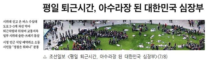 ‧ 조선일보 <평일 퇴근시간, 아수라장 된 대한민국 심장부>(7/8, 10면, 이슬비·김선엽 기자, https://me2.do/FBR3OST4)