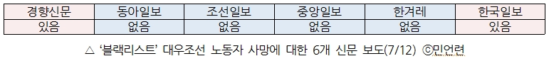 11일, 대우조선해양과 삼성중공업 간 ‘블랙리스트 공유 의혹’을 제기했던 대우조선해양 물량팀 재하청 일용직 노동자가 대우조선해양 1도크 블록 안에서 숨진 채 발견됐다. 이를 보도한 것은 경향신문과 한국일보다. 동아일보와 조선일보, 중앙일보, 한겨레는 보도하지 않았다.