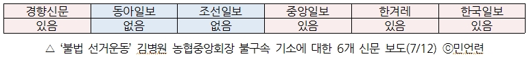 11일 서울중앙지검 공안2부(부장검사 이성규)는 김병원 농협중앙회 회장을 공공단체 등 위탁 선거에 관한 법률 위반 혐의로 불구속 기소했다. 이를 보도한 것은 경향신문과 중앙일보, 한겨레, 한국일보다. 동아일보와 조선일보는 보도하지 않았다. 보도를 내놓은 매체 중 한국일보는 이번 기소에 대해 “검찰이 6개월간 핵심 수사인력을 가동해 저인망 수사를 벌인 데 비해 초라한 성적이라는 평가”를 덧붙였다.