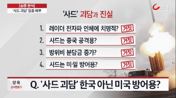 TV조선은 여기서 한 걸음 더 나아가 전문가들을 불러놓고 ‘괴담’에 대해 대담을 펼치기도 했다. TV조선 <심층분석/‘사드 괴담’ 집중 해부>는 △ “사드의 전자파가 암과 불임을 야기한다” △ “사드 전자파가 참외 등 농산물에 심각한 영향을 준다” △ “사드는 중국 공격용이다” △ “사드로 인해 한국 측의 방위분담금이 증가할 것이다” △ “사드는 미국과 일본을 방어하기 위한 것이다” 등 모든 ‘인터넷 괴담’을 김윤명 단국대 교수, 양욱 국방안보포럼 연구위원의 발언으로 반박했다.