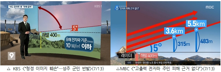 KBS와 MBC는 전자파가 무해하다는 보도까지 똑같이 냈다. 특히 KBS <“청정 이미지 훼손”…성주 군민 반발>은 눈속임에 가까운 보도다. 이 보도는 보도 첫머리에서 성주 주민들이 “군민 4만 5천명 가운데 40%인 17,800명이 사드 레이더의 전자파 위험범위 안에 살고 있다고 주장”하고 있다며 성주 주민들의 반발을 전달했다. 여기까지 보면 주민들의 반발을 다룬 보도로 보이지만 곧바로 전자파가 무해하다는 국방부 입장을 장황하게 덧붙여 사실상 주민 반발을 부당한 것으로 몰았다. “사드 레이더는 적의 미사일 추적을 위해 지상에서 최소 5도 위로 전자파를 발사”하는데 “이 아래쪽, 안전 지역의 전자파 강도는 우리나라 전파법이 정하는 전력밀도 기준인 제곱미터당 10와트 이하”이므로, “성주의 사드 배치 지역 같은 산지의 경우 아래 지역은 영향을 받지 않”는다는 것이다. “혹시 영향을 받는 각도에 있더라도 레이더로부터 100m만 떨어져 있으면 역시 전자파 피해는 없습니다”는 설명도 덧붙였다. MBC <“고출력 전자파 주민 피해 근거 없다”>도 비슷한 내용이다.