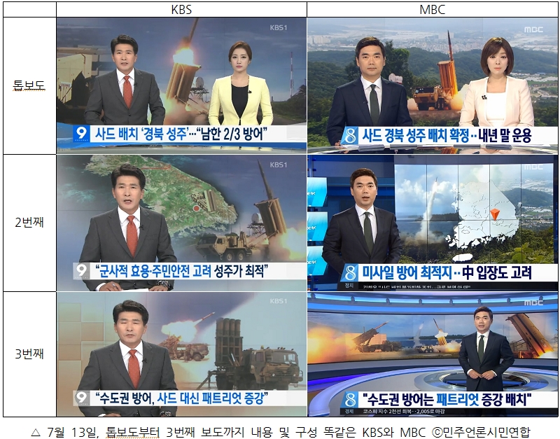 8일 사드 배치 최종 결정 이후 KBS와 MBC는 정부의 입장을 그대로 전달하는 수준을 넘어, 적극적으로 대변하고 확대재생산하고 있다. 13일 보도를 보면 두 방송사는 약속이나 한 듯 같은 내용, 같은 구성으로 뉴스를 채웠다.