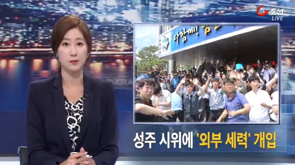 ․ TV조선 <전문 시위대 어김없이 등장>(7/15, 6번째, 조덕현 기자, https://me2.do/5Keu3eXp), <성주 시위에 ‘외부 세력’ 개입>(7/17, 6번째, 이미지 기자, https://me2.do/Gsqs5CML), <외부 세력 규모‧실체 파악 초점>(7/17, 7번째, 이심철 기자, https://me2.do/FWsI7Wh8)