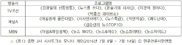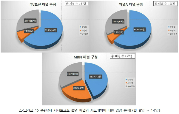이처럼 패널 구성을 관련 전문가를 포함한 사드배치 찬성 인물들 위주로 채우면서 프로그램은 정부와 보수언론의 입장을 옹호하는 논의로 이어졌다. 여기에 일부 진행자들의 편향된 질문까지 더해지며 일방적 분위기는 공고화됐다. 패널 구성 조사는 모니터 기간 해당 방송 및 다른 방송에서 직간접적으로 사드배치와 관련해 당사자들이 제시한 의견을 토대로 분류했다.
