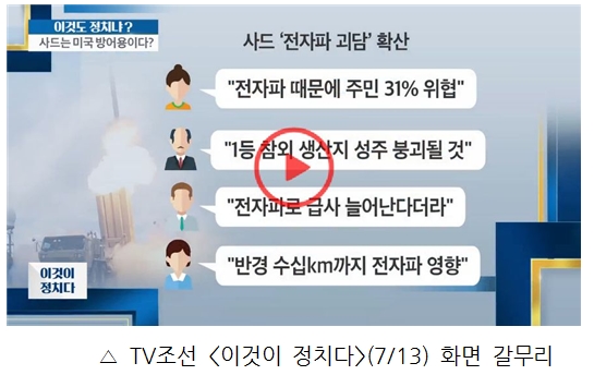 종편들은 사드배치를 반대하는 가장 큰 이유인 전자파의 유해성에 대해 ‘정부 발표니 믿으라’는 무책임한 태도로 일관했다. ‘레이더 전방 100m 밖은 안전하다’는 국방부 발표와 달리, 2012년판 미국 육군 교범에 ‘레이더 3.6㎞ 까지는 비통제인원의 출입을 제한 한다’고 달리 규정돼 있음에도 논리적 설명 없이 무해성을 단정한 것이다. 채널A <뉴스특급>(07/14)에서 전승민 동아사이언스 기자는 ‘대다수 언론에서 사드가 무해하다 입을 모으고 있는데, 정말 안전하냐’는 앵커의 질문에 “일단 안전하다고 보는 게 맞을 것 같습니다”라고 말했다. 전날 TV조선 <김광일의 신통방통>의 진행자 김광일도 관련 기사를 전하며 “불임유발? 100m 이상 떨어지면 인체에 해로울 게 없다”고 단언했다. 그러나 이를 뒷받침 하는 전문가 의견이나 관련 자료는 전혀 제시하지 않았다.