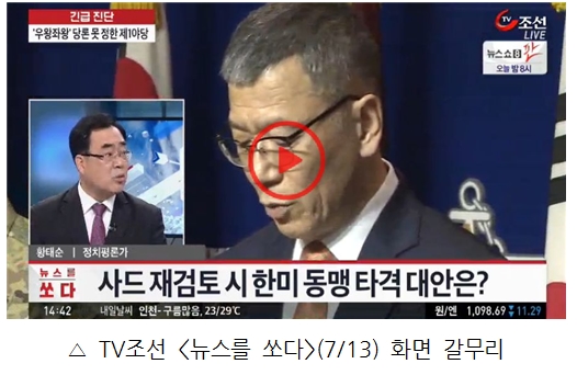 자주국방 차원을 넘어 중국에 대한 적대적 언사로까지 확대된 강경론은 사드배치를 반대하는 이들을 ‘한미동맹 파탄세력’으로 몰아세우기도 했다. TV조선 <뉴스를 쏘다>(7/13)에서 유아름 앵커가 “사드배치 된 것을 되돌렸을 때 미국과의 관계는 어떻게 회복할 수 있을지에 대한 대책이 하나도 없다는 게 (반대자들의)문제라는 지적이 나옵니다”라며 운을 떼자 황태순 정치평론가는 “‘중국이 두려워서 재검토 하자’ 하는 순간 한미동맹 깨지는 것”이라고 답했다. ‘사드배치 재검토가 대미관계 악화로 이어질 것’이란 섣부른 가정 하에 그 결과에 대한 책임까지 반대론자에게 묻고 있는 셈이다. 반면 이번 결정으로 냉랭해진 한중관계와 그로인해 우리가 입게 될 직간접적 피해에 대한 책임소재는 전혀 다루지 않았다.