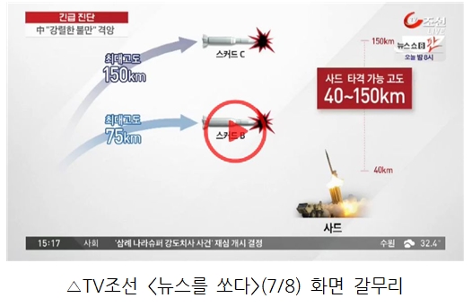 하지만 사드에 대해 미국 국방부 산하 미사일방어국(MDA)에서조차 ‘실전에서 제대로 검증된 적이 없다’는 실험 자료를 공개하고, 지난해 미국 국방 당국도 상원 의회에 사드의 신뢰성에 의문을 제기하는 보고서를 제출한 점 등을 감안하면 사드에 대한 정부의 확신과 이를 그대로 옮기는 종편의 태도는 지나치게 맹목적이다. 더구나 유사 시 북한이 한꺼번에 발사할 수천 개의 장사정포와 미사일에 맞서 고작 48발의 요격미사일을 갖춘 사드 포대의 실질적 효용성은 패트리어트 미사일을 고려해도 매우 낮다는 게 전문가들의 중론이다. 이를 감안한 듯 문성묵 한국국가전략연구원 통일전략센터장은 TV조선 <뉴스를 쏘다>(7/8)에서 “효용성을 따질 것이 아니라 미군 당국에서 주한미군과 한국에 거주하는 미국 국민들, 또 우리 동맹인 한국 국민들과 한국군을 (지키는)유용한 무기라는 판단 하에 요청을 했다”는 발언을 내놓기도 했다.