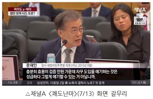 문재인 전 대표를 비판하기 위해 억지주장도 서슴지 않았다. 채널A<쾌도난마>(7/13)에 나온 이현종 문화일보 논설위원은 “어떻게 재검토하자는 겁니까? 또 공론화 하자는데 이건 이미 2년 전부터 주한 미사령관이 이야기해서 한참 공론화가 됐던 문제입니다. 본인도 그때 국방위원으로서 있었구요. 그럼 지금부터 하 세월하면서 중국한테 허락을 받아야 됩니까? 본인이 대통령되면 사드를 무를 겁니까?”라고 말했다. 방송에선 지난해 국회 국방위원회에 출석한 문 전 대표의 당시 발언을 자료화면으로 내보냈다. 같은 날 MBN <뉴스와이드>에서 황태순 정치평론가 역시 “벌써 2년 전에 김진명의 ‘싸드’가 베스트셀러가 될 정도로. 사실 알게 모르게 2014년 6월부터 이 문제는 공론화 돼 있었던 거에요”라고 전했다. 그러나 정부가 지난 2년 간 사드논란이 불거질 때 마다 ‘요청도 협의도 결정도 없다’는 ‘3NO’ 입장을 고수하며, 정작 가장 중요한 국민적 합의와 후보지역 주민 설득작업엔 전혀 나서지 않았던 점을 고려하면 ‘공론화가 됐다’는 논리는 정치공세를 펴기 위해 엄연한 사실조차 왜곡하는 처사다. <끝>