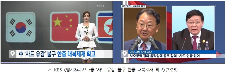‧ KBS <앵커&리포트/중 ‘사드 유감’ 불구 한중 대북제재 확고>(7/25, 3번째, 조빛나 기자, https://me2.do/54lgjiyY)