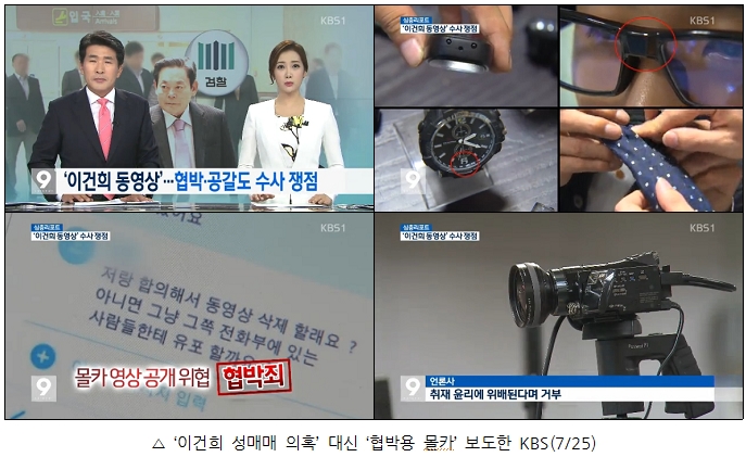 KBS <심층리포트/‘이건희 동영상’…협박‧공갈도 수사 쟁점>(7/25)는 ‘심층리포트’라는 이름을 달고 이건희 회장 성매매 의혹 동영상에 대한 깊이 있는 분석을 내놓을 것처럼 보였다. 그러나 실상은 이건희 회장을 보호하기 위한 ‘꼼수’에 불과했다. 이 보도는 이미 보도 제목에서 성매매 의혹이 아닌 ‘협박‧공갈’을 쟁점으로 삼고 있다. 리포트가 시작되면 느닷없이 “몰래카메라가 장착된 자동차 열쇠”와 “넥타이나 안경, 시계 등으로 위장된 몰래카메라”가 화면으로 소개된다. 여기에 “유튜브에 올리겠다, 카카오톡에 올리겠다 이런 케이스들이 있고..돈 뜯어서 협박하는 경우 (많아요)”라는 동영상 삭제 전문가 인터뷰도 덧붙였다. 다음 화면은 성관계 동영상 파문으로 법정 공방을 벌였던 배우 이병헌 씨를 등장시켜 “몰카 영상을 공개하겠다는 등의 위협을 가했다면 협박죄, 협박하면서 돈까지 요구했다면 공갈죄로 처벌”된다고 강조했다. 이 대목에서는 화면에 큼지막한 빨간 자막으로 “협박죄” “공갈죄”가 부각되기도 했다. 이렇게 전체 2분여의 보도 분량 중 1분을 ‘협박용 몰래카메라’에 할애한 뒤에야 이 보도는 이건희 회장을 언급했는데 황당하게도 그 내용은 “이건희 삼성전자 회장의 성매매 의혹을 촬영한 일당도 삼성 측에 돈을 요구”했다는 것이다. 오현태 기자는 여기서 “몰카 촬영 행위는 형사처벌 뿐만 아니라 최근에는 초상권 침해에 따른 민사 손해배상 소송까지 이어지는 추세”라며 다시 ‘몰카 처벌’에 목소리를 높였다. 심지어 “대부분의 언론사들은 처음부터 범죄에 악용할 목적으로 불법 촬영된 영상물을 취재 자료로 활용하는 것은 언론윤리에 위배된다며 거부”했다며 이를 보도한 뉴스타파를 ‘언론윤리에 위배된 언론’으로 매도했다.
