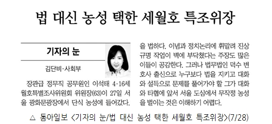 ‧ 동아일보 <기자의 눈/법 대신 농성 택한 세월호 특조위장>(7/28, 12면, 김단비 기자, https://me2.do/xDcVrqDC)